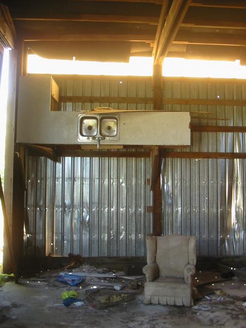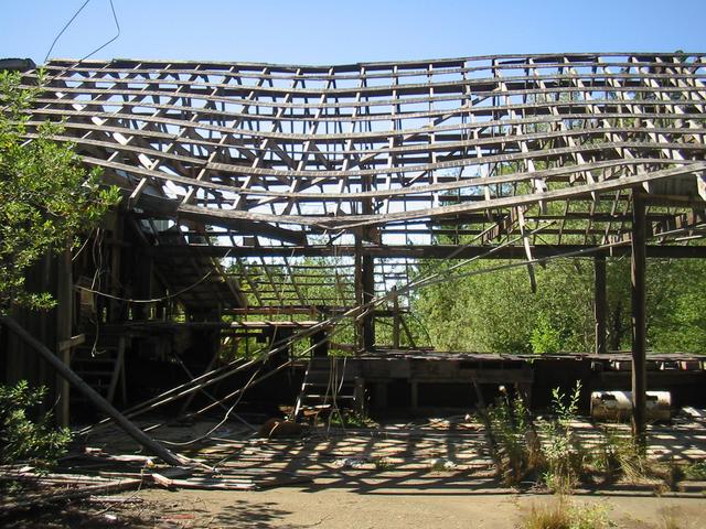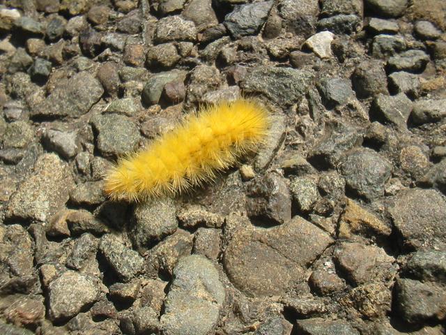 During a lonely stretch of highway, I saw a yellow caterpillar crossing the highway. I stopped because I wanted to take a picture of it as it reached the yellow lines at the centre of the street. It was quite suspenseful watching it cross the highway as multiple cars came along and narrowly missed it. Unfortunately, I think I caused its death when my presence caused a logging truck to move toward the centre of the highway and run it over. I felt pretty stupid afterwards, since I could have just picked it up and moved it to where I wanted it, and then brought it to the other side of the road. This stretch of highway also had several abandoned, dilapitated old industrial buildings that were fun to explore.