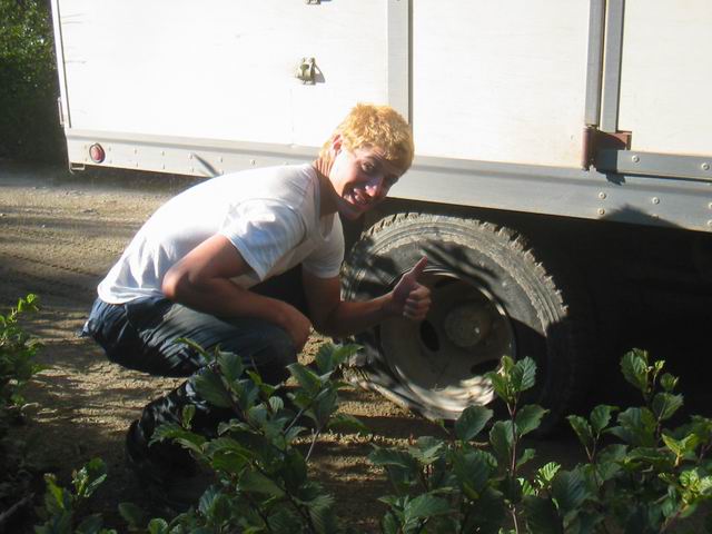 On the way back to camp one day both the tyres of a dual wheel on the truck went flat. We were just driving along and heard a pop followed by loud hissing, and there was a huge tear in one of the tyres, but we never did find what had punctured it. We were the last truck out, and since we only had one spare tyre, we had to call another truck on the radio to come back and lend us their spare. When they finally arrived we found that their spare was flat, so we had to call yet another truck to come back. We didn't make it back to camp until 8:30, but luckily someone had notified the kitchen (which closes at 8:00) so they stayed open a bit late and prepared late plates for those who did not arrive on time.